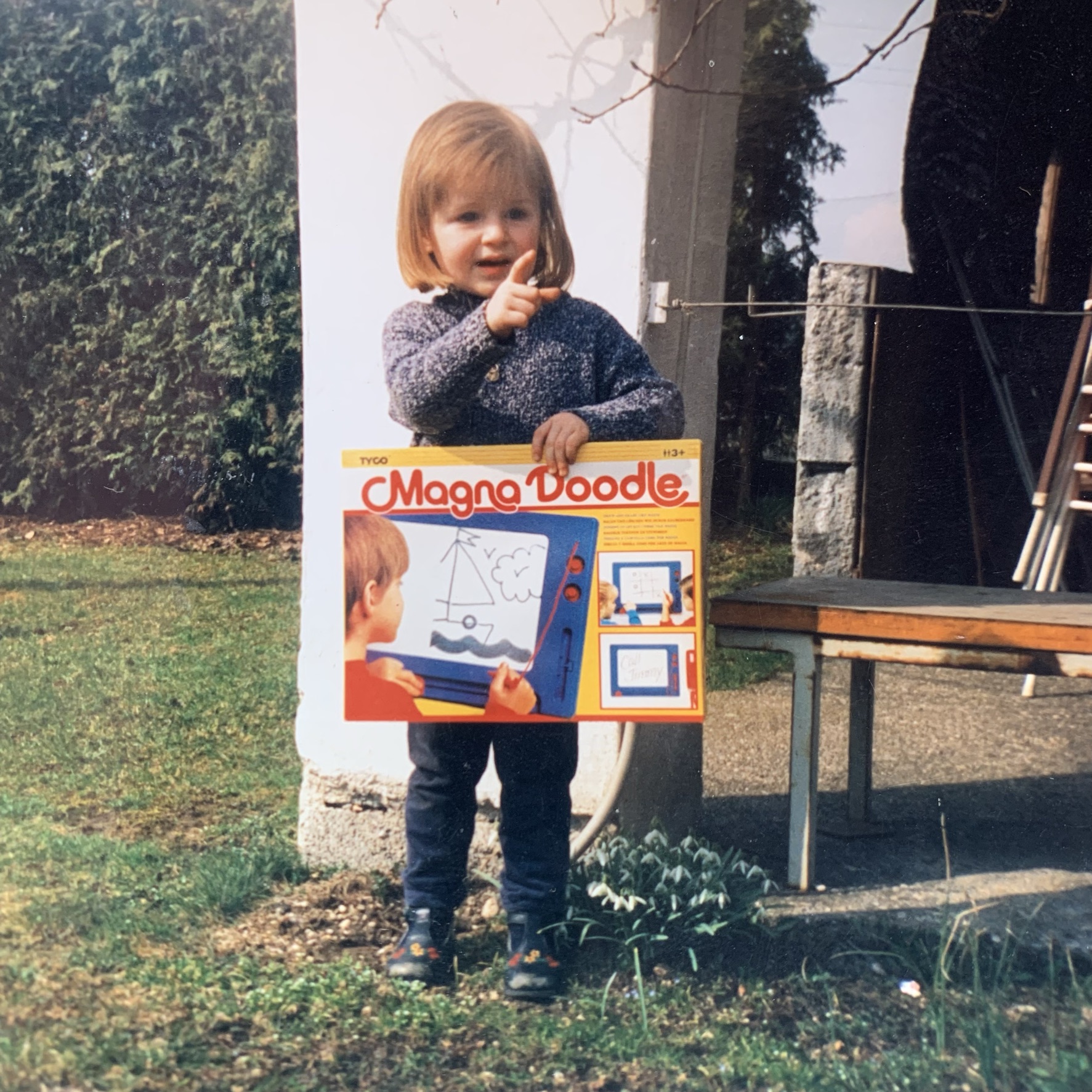 Alles begann mit einem Osterfoto von mir als Mini-Mensch – 3 oder 4 Jahre alt, bewaffnet mit einem Magna Doodle (die OG-Version eines Grafiktabletts). Eigentlich hätte es da schon jeder wissen müssen: Dieses Kind wird mal kreativ. Und wie’s kommen musste: Mit meinem ersten eigenen PC wurde es noch viel spannender für mich, sodass ich mit 12 schon angefangen habe, mich durch die Adobe-Programme zu wühlen, komplett selbst beigebracht. Nebenbei habe ich das Fotografieren entdeckt… und damit war’s endgültig vorbei. Ich war verloren an die Kreativität.